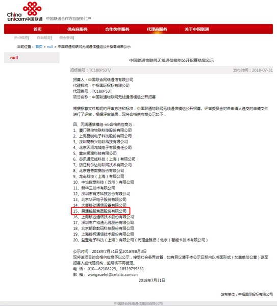 p2018年7月31日,中国联通合作方自服务门户发布公示,中国联合网络通信有限公司通过代理机构——中招国际招标有限公司进行中国联通物联网无线通信模组公开招募后,根据招募文件载明的评审方法和标准,评审委员会对各申请人递交的申请文件进行了评审,根据评审和公示结果,吴通集团成功入围中国联通无线通信模组-nb合格供应商。该公示时间为2018年7月31日至2018年8月3日。