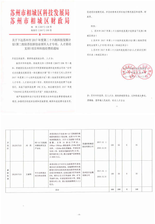 根据苏州相城区科技发展局、苏州市相城区财政局相科(2017)128号、相财行(2017)200号文件,喜讯传来,吴通集团研发人才刘博士,成功入选第二批姑苏创新创业领军人才,其立项将受相关政策支持。近日,刘博士也已签订合同并已通过审核,待项目逐步开展落实。