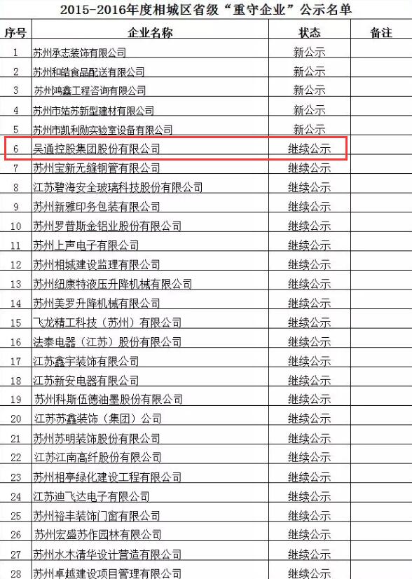 日前,省工商局联合省企业信用管理协会公示2015~2016年度省级“守合同重信用”企业,相城区28家企业上榜。这28家上榜企业中,5家企业为首次获评定,另有23家企业为参加复评通过。吴通集团复评成为“守合同重信用”企业。