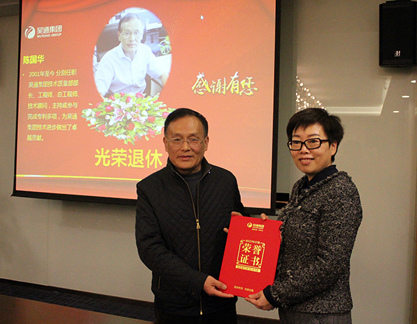 胡总在会上表示,陈工是吴通人的老师,在吴通集团的十五年里,发光发热,无私奉献,是吴通不可多得的人才。他在多年的工作里,能够充分发挥传帮带精神,将自身所学毫无保留地教给后辈新人。她希望在今后,陈工可以安心享受晚年生活的同时,也欢迎继续为吴通部分技术研发进行指导。现场,她还为陈工颁发了“光荣退休”荣誉证书。