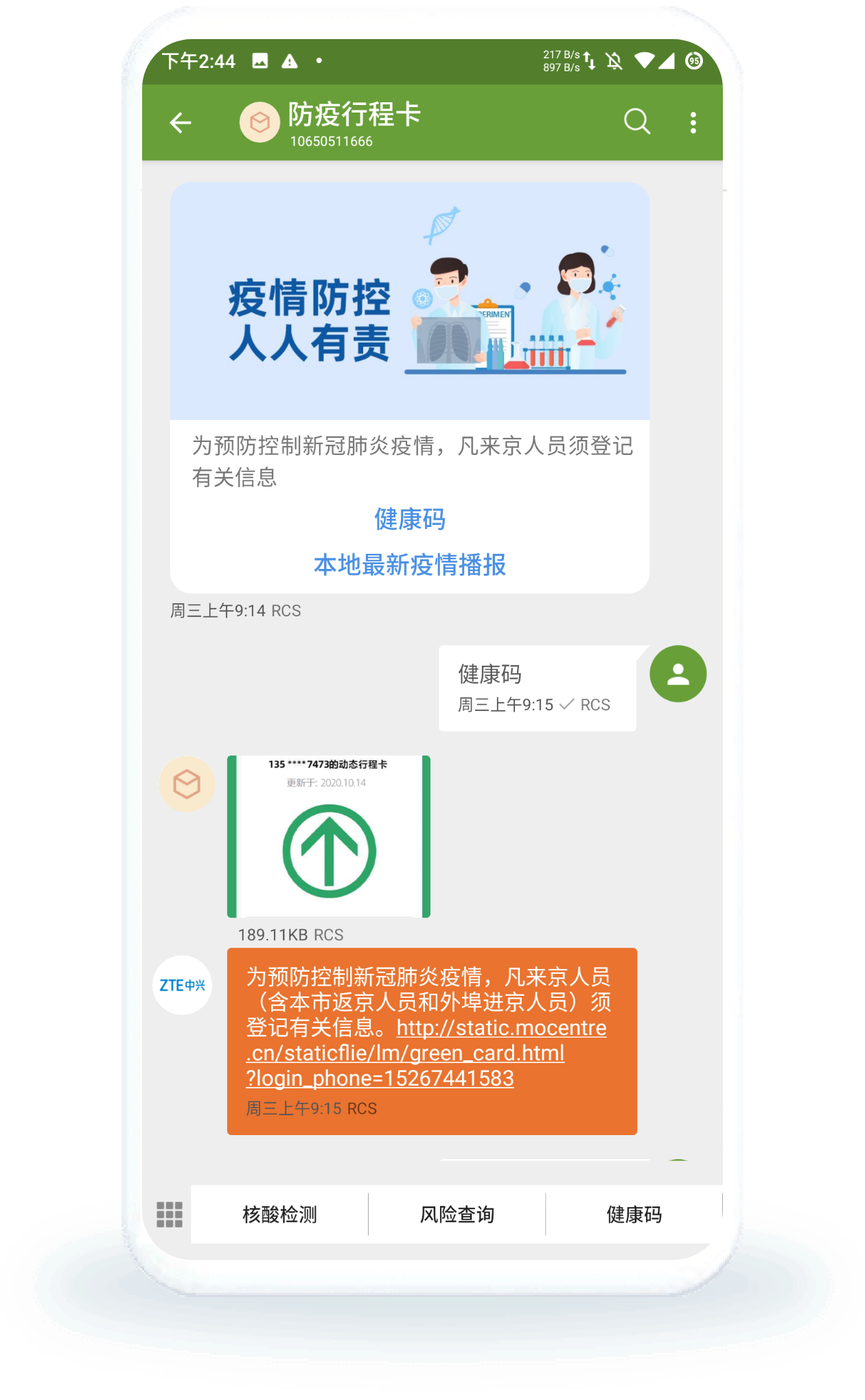 防疫行程卡借助5G消息原生态短信入口,用户无需下载注册,身份认证高度安全保密,只需要在消息界面输入需求就能立刻获取服务入口。利用文字、语音、选项卡等全新的富媒体交互模式,嵌入疫情防控服务场景,Chatbot会话式智能互动,你一问我一答,服务更高效、转化率更高。用户可在5G消息窗口查看健康码、关注疫情动态、查询风险、完成核酸检测报名等。这意味着5G消息在政务服务中得到了充分的应用,让民生办事更高效、更便捷,为百姓提供更安全、优质的民生服务新体验。