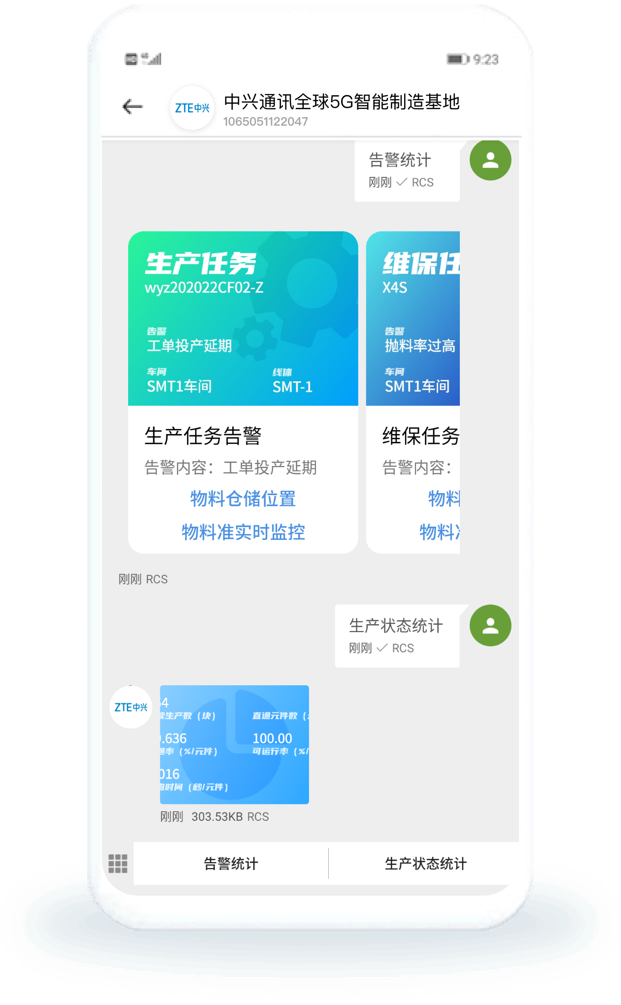 作为此次展出的重点案例,中兴通讯全球5G智能制造基地,在国都互联5G消息技术的支持下,实现了基地生产任务、物流任务、维保任务、检验任务整体生产流程险情预警在5G消息窗口的实时监管,Chatbot智能交互,无需等待人工延时服务,实时对话,及时响应,为安全生产保驾护航,助力中兴通讯打造安全高效协同的智能制造基地。