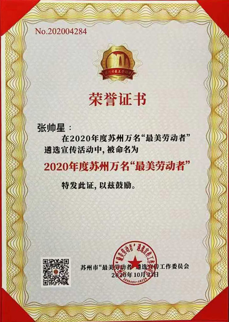 祝贺 丨 物联科技员工张帅星获评苏州“最美劳动者”
