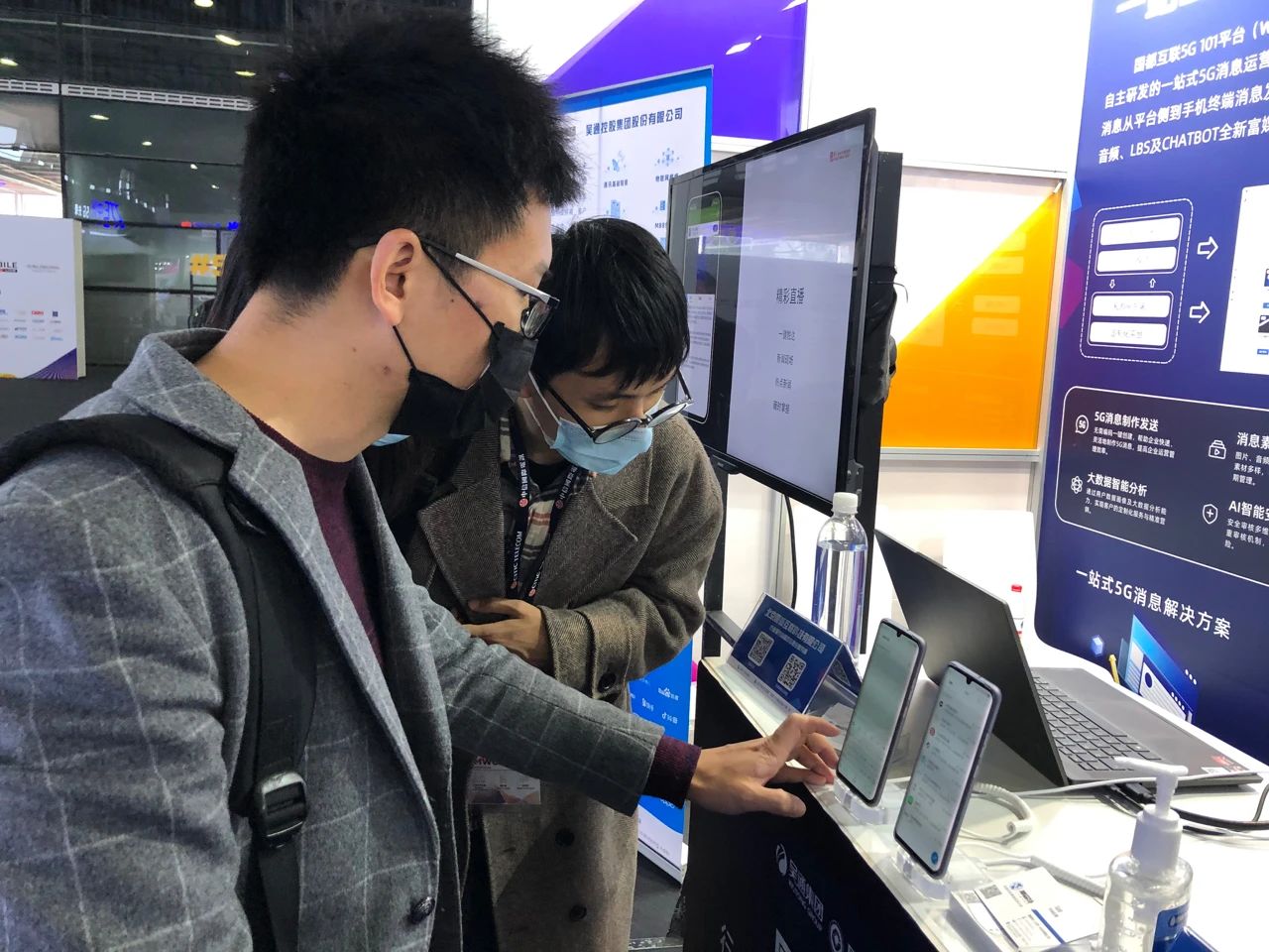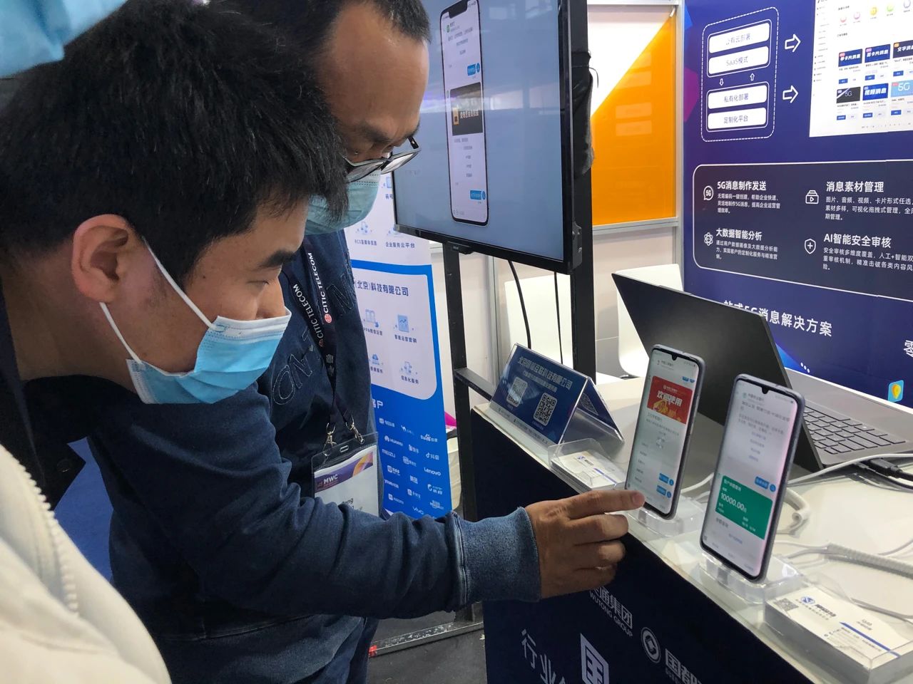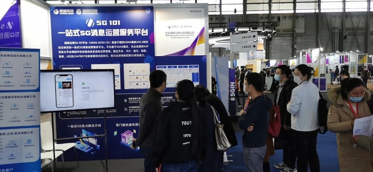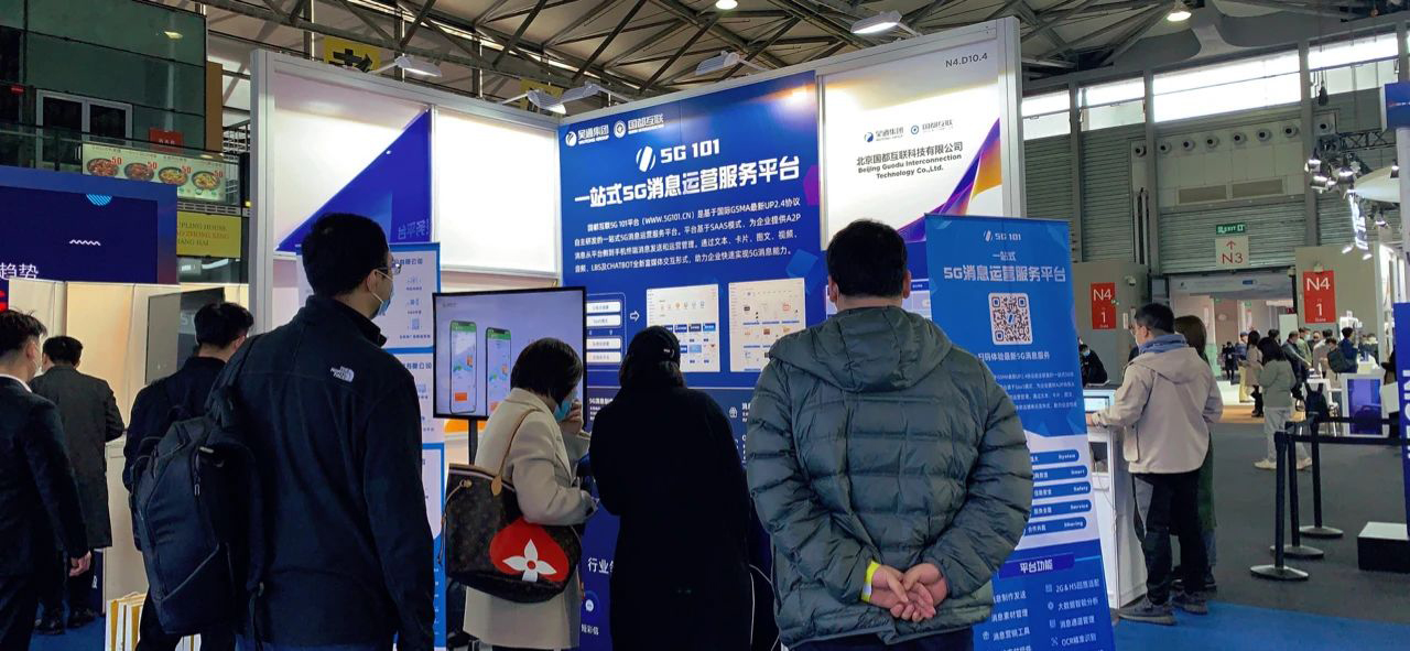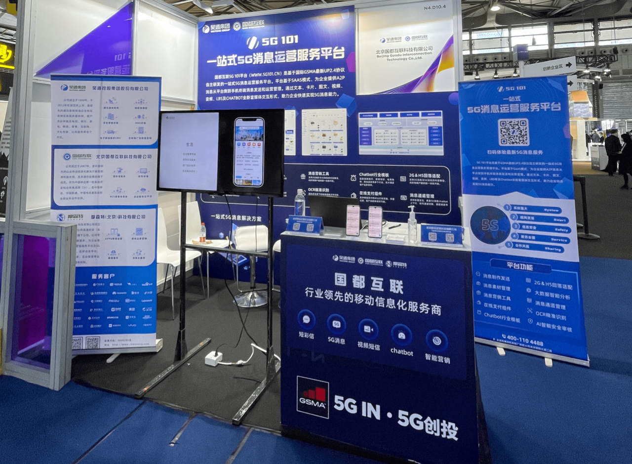在上海新国际博览中心(SNIEC)N4.D10.4展位,国都互联展台人气火爆,全方位展示了国都互联基于5G消息应用的最新研发成果,包括新华报业传媒、江苏银行、7KID智慧校园、爱奇艺、去哪儿等众多行业客户的5G消息综合解决方案,涵盖金融银行、新闻报业、教育培训、影视传媒等服务领域。参观者现场就能在手机上通过Chatbot对话服务推送和菜单按钮体验5G消息服务,使参会嘉宾全方位了解体验国都互联在5G消息领域的运营服务能力,获得诸多业内人士的认可和关注。