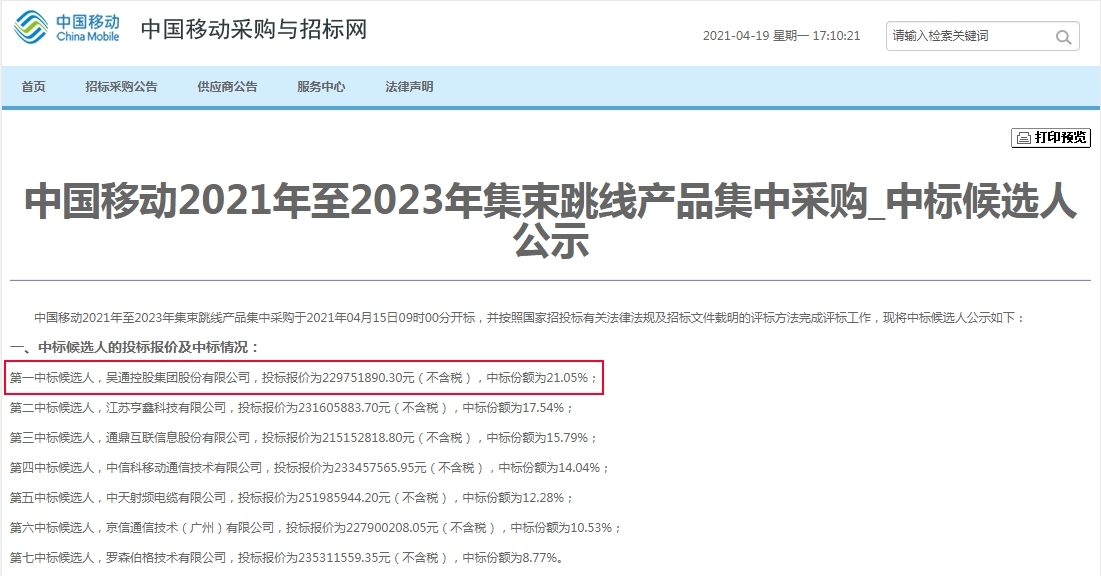 2021年4月15日,《中国移动2021年至2023年集束跳线产品集中采购中标候选人公示》在中国移动采购与招标网发布,经过四天的公示期本次集束跳线产品集采招标项目终于落下帷幕,共有七家企业成功入围中标候选人。吴通集团继上一轮(2019年-2020年)集束跳线集采项目中标后,再次以第一名身份成功中标本次集采项目,中标份额为21.05%,进一步巩固了在中国移动集束跳线产品的市场地位。