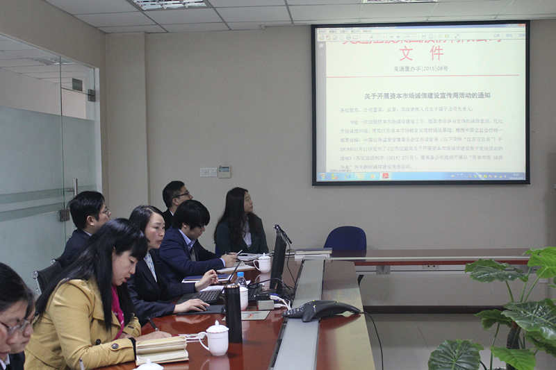 首先,大家学习了中国证监会江苏监管局2015年11月11日下发的《江苏证监局关于开展资本市场诚信建设集中宣传活动的通知》(苏证监法制字〔2015〕271号),姜红女士给与会人员做了详实解读,并结合公司实际情况,由证券部组织开展本次宣传活动,将采取电子屏滚动标语、宣传栏展示案例等形式积极开展活动。