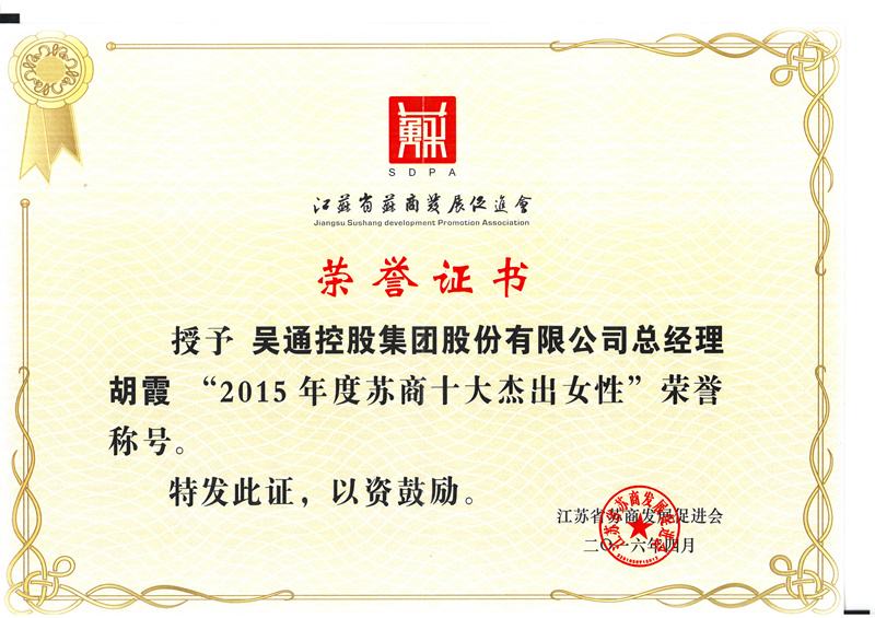 “金茉莉杰出奖·2015年度苏商十大杰出女性”获奖名单的发布,是对2015年度江苏商界杰出女性的最高赞誉。吴通集团总经理胡霞从众多的候选人中脱颖而出并最终获奖,源于其独有的人格魅力,更源于其长期带领吴通集团发展所取得的巨大成就。胡总是睿智豁达的现代女性,她自尊、自立、自信、自强,有着超出常人的商业魄力,是优秀职业经理人的典范。她坚信知识就是力量,以超前的胆略、坚韧与执著、高度敬业的精神,为吴通控股集团的长远发展做出了卓越的贡献。