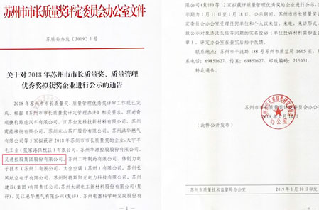 吴通集团荣获2018年苏州市质量管理优秀奖